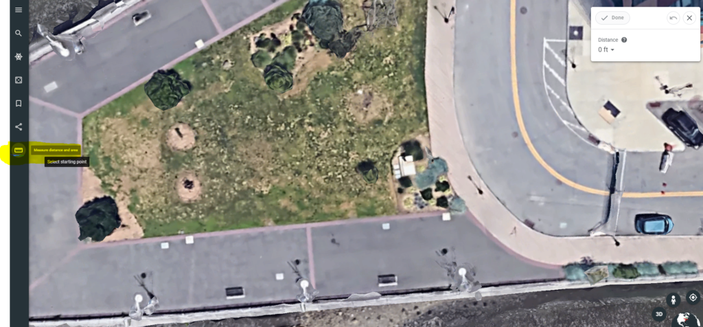 Now that you’re in the satellite view you can zoom in to the desired level, center on the spot you want to measure and begin taking measurements. To do that click on the measurement tool highlighted in the photo below. It’s on the left side of the screen at the bottom of the sidebar menu.
